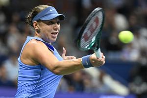 (250905) -- NUEVA YORK, 5 septiembre, 2025 (Xinhua) -- Amanda Anisimova devuelve la pelota durante el partido de semifinal de...