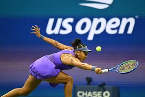 (250905) -- NUEVA YORK, 5 septiembre, 2025 (Xinhua) -- Osaka Naomi devuelve la pelota durante el partido de semifinal de...