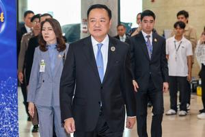 (250905) -- BANGKOK, 5 septiembre, 2025 (Xinhua) -- Anutin Charnvirakul (c), líder del opositor Partido Bhumjaithai, es visto en la...