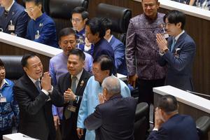 (250905) -- BANGKOK, 5 septiembre, 2025 (Xinhua) -- Anutin Charnvirakul (i-abajo), líder del opositor Partido Bhumjaithai, reacciona al recibir felicitaciones...
