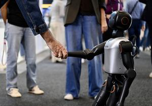 (250906) -- BERLIN, 6 septiembre, 2025 (Xinhua) -- Imagen del 5 de septiembre de 2025 de un visitante estrechando la mano de un robot humanoide en la IFA Berlín 2025, en Berlín, Alemania. La IFA Berlín 2025, una de las ferias comerciales más grandes del mundo dedicada a la electrónica de consumo y los electrodomésticos, abrió el viernes, enfocándose en temas orientados al futuro como la tecnología de la información, la inteligencia artificial, el software y la potencia informática, así como soluciones sostenibles para el hogar, la movilidad y el estilo de vida. (Xinhua/Zhang Haofu) (oa) (da)