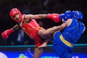 (250905) -- BRASILIA, 5 septiembre, 2025 (Xinhua) -- Beatriz Adriao (i), de Brasil, compite con Krisna Malecdan (d), de Filipinas, durante el combate femenino de semifinales de sanda de 56 kilogramos, en el 17 Campeonato Mundial de Wushu, en Brasilia, Brasil, el 5 de septiembre de 2025. (Xinhua/Lucio Tavora) (lt) (oa) (ra) (vf)