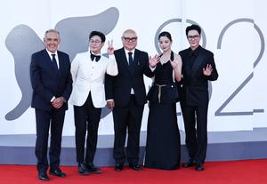 (250905) -- VENECIA, 5 septiembre, 2025 (Xinhua) -- El director del Festival de Cine de Venecia, Alberto Barbera (i), y Cai Shangjun (3-i), director de la película "The Sun Rises On Us All", junto a los miembros del reparto de la película, Zhang Songwen (2-i), Xin Zhilei (2-d), y Feng Shaofeng, posan en la alfombra roja del estreno durante el 82º Festival de Cine de Venecia, en Venecia, Italia, el 5 de septiembre de 2025. (Xinhua/Li Jing) (jg) (da) (ce)