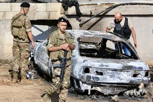 (250909) -- JIYEH, 9 septiembre, 2025 (Xinhua) -- Soldados libaneses inspeccionando los restos de un automóvil impactado por drones israelíes, en Jiyeh, Líbano, el 9 de septiembre de 2025. (Xinhua/Ali Hashisho) (oa) (ah) (ce)