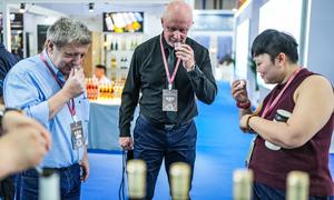 (250909) -- GUIYANG, 9 septiembre, 2025 (Xinhua) -- Consumidores degustan bebidas durante la 14 Exposición Internacional de Bebidas Alcohólicas de...