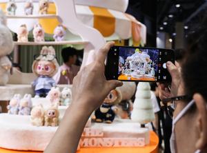 (250910) -- BEIJING, 10 septiembre, 2025 (Xinhua) -- Un visitante toma fotografías en un estand de Pop Mart durante la...