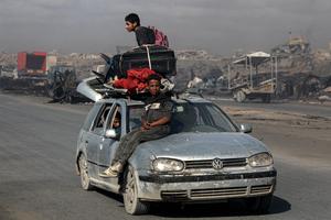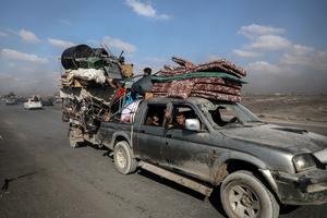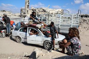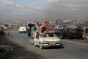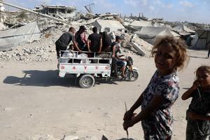 (250909) -- GAZA, 9 septiembre, 2025 (Xinhua) -- Palestinos desplazados huyen con sus pertenencias desde el norte de la Franja...