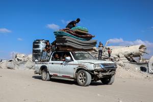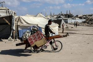 (250909) -- GAZA, 9 septiembre, 2025 (Xinhua) -- Un palestino desplazado huye con sus pertenencias desde el norte de la...