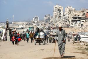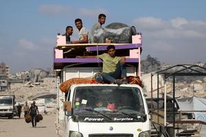 (250909) -- GAZA, 9 septiembre, 2025 (Xinhua) -- Palestinos desplazados huyen con sus pertenencias desde el norte de la Franja...