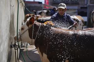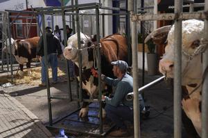 (250909) -- MONTEVIDEO, 9 septiembre, 2025 (Xinhua) -- Un hombre baña a un novillo durante la edición 120 de la...