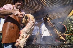(250909) -- MONTEVIDEO, 9 septiembre, 2025 (Xinhua) -- Una persona cocina carne a las brasas durante la edición 120 de...