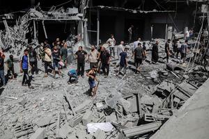 (250911) -- GAZA, 11 septiembre, 2025 (Xinhua) -- Palestinos inspeccionan el daño de varias viviendas en el interior del campamento...