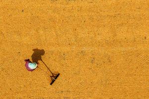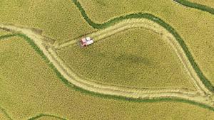 (250911) -- BEIJING, 11 septiembre, 2025 (Xinhua) -- Vista aérea tomada con un dron de una cosechadora trabajando en un...