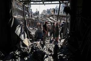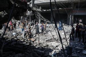 (250911) -- GAZA, 11 septiembre, 2025 (Xinhua) -- Palestinos inspeccionan el daño de varias viviendas en el interior del campamento...