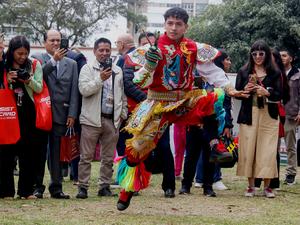 (250911) -- LIMA, 11 septiembre, 2025 (Xinhua) -- Una persona realiza la danza de las tijeras en la VIII Feria...