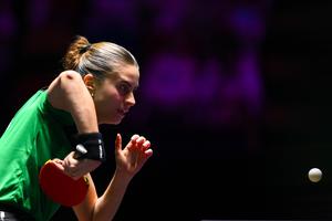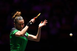 (250911) -- MACAO, 11 septiembre, 2025 (Xinhua) -- Bruna Takahashi, de Brasil, compite durante el partido de octavos de final...