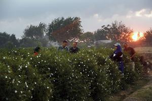 (250911) -- GHARBIA, 11 septiembre, 2025 (Xinhua) -- Agricultores cosechan flores de jazmín en un campo, en la aldea de...