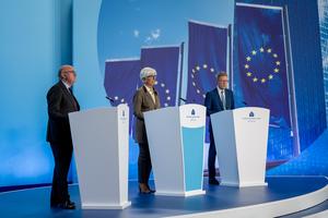 (250911) -- FRANKFURT, 11 septiembre, 2025 (Xinhua) -- La presidenta del Banco Central Europeo, Christine Lagarde (c), asiste a una...