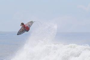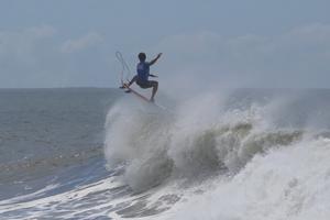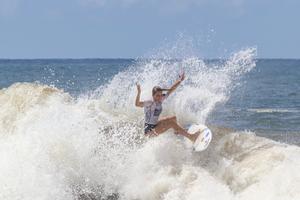 (250914) -- LA LIBERTAD, 14 septiembre, 2025 (Xinhua) -- Dane Henry, de Australia controla su tabla sobre una ola, durante...