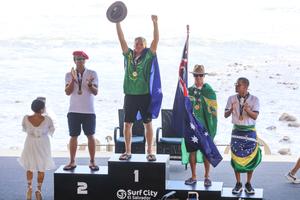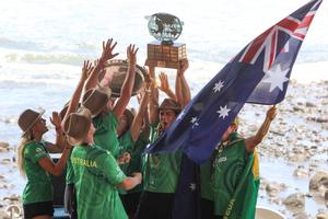 (250914) -- LA LIBERTAD, 14 septiembre, 2025 (Xinhua) -- Surfistas de la selección de Australia, festejan con los trofeos de...
