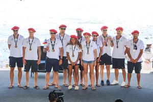(250914) -- LA LIBERTAD, 14 septiembre, 2025 (Xinhua) -- Surfistas de la selección de Francia, festejan con sus medallas de...