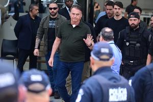 (250914) -- BRASILIA, 14 septiembre, 2025 (Xinhua) -- El expresidente brasileño Jair Bolsonaro (c) sale de un hospital durante una...