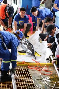 (250914) -- WANNING, 14 septiembre, 2025 (Xinhua) -- Rescatistas trasladan al delfín "Wan Wan" en una camilla en una instalación...