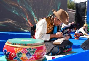 (250912) -- LHASA, 12 septiembre, 2025 (Xinhua) -- Un artesano realiza tallas en madera en la ceremonia de inauguración de...