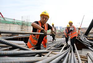 (250912) -- SHIJIAZHUANG, 12 septiembre, 2025 (Xinhua) -- Trabajadores mueven barras de acero en un sitio de construcción de una...