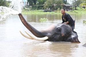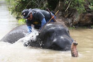 (250912) -- AYUTTHAYA, 12 septiembre, 2025 (Xinhua) -- Un trabajador baña a un elefante en un río junto a la...