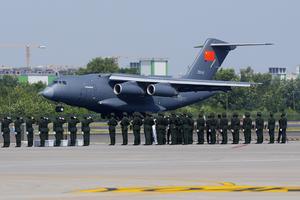 (250912) -- SHENYANG, 12 septiembre, 2025 (Xinhua) -- Un avión de transporte Y-20 de la Fuerza Aérea del Ejército Popular...
