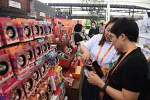 (250912) -- BEIJING, 12 septiembre, 2025 (Xinhua) -- Imagen del 11 de septiembre de 2025 de personas seleccionando productos culturales...