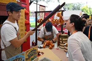 (250912) -- BEIJING, 12 septiembre, 2025 (Xinhua) -- Un expositor (i) presenta productos culturales y creativos de pato asado exhibidos...