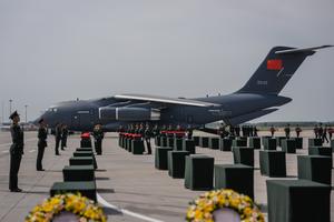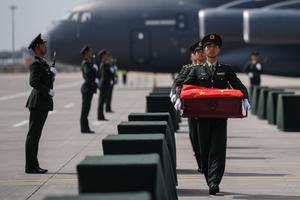(250912) -- SHENYANG, 12 septiembre, 2025 (Xinhua) -- Soldados escoltan féretros con los restos de los mártires de los Voluntarios...