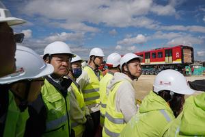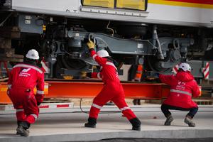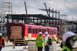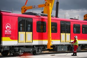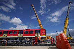 (250911) -- BOGOTA, 11 septiembre, 2025 (Xinhua) -- Trabajadores observan uno de los vagones durante la llegada del primer tren...