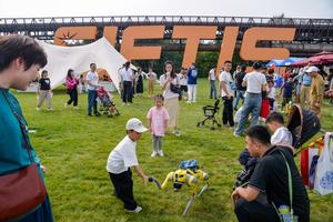 (250913) -- BEIJING, 13 septiembre, 2025 (Xinhua) -- Un niño interactúa con un robot en la sección al aire libre...