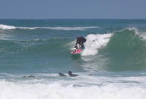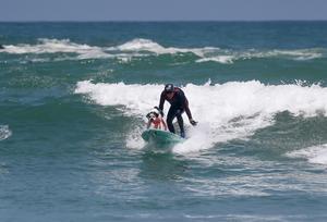 (250913) -- LIMA, 13 septiembre, 2025 (Xinhua) -- Domingo Pianezzi surfea con su perro Makakilo en la playa San Bartolo,...