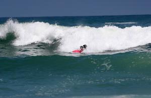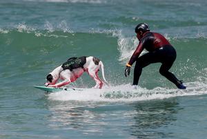 (250913) -- LIMA, 13 septiembre, 2025 (Xinhua) -- El perro Makakilo surfea en la playa San Bartolo, en el sur...