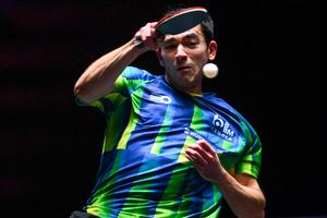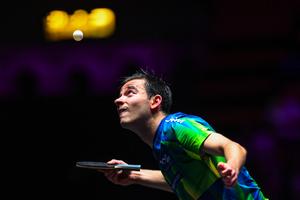 (250913) -- MACAO, 13 septiembre, 2025 (Xinhua) -- Hugo Calderano, de Brasil, compite durante el partido de cuartos de final...