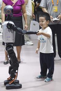 (250912) -- BEIJING, 13 septiembre, 2025 (Xinhua) -- Un niño interactúa con un robot humanoide en la Feria Internacional de...