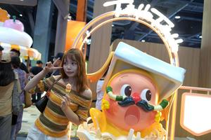 (250912) -- BEIJING, 13 septiembre, 2025 (Xinhua) -- Una visitante posa para fotografías en el estand de Pop Mart en...