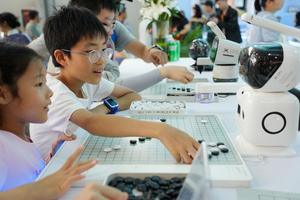 (250913) -- BEIJING, 13 septiembre, 2025 (Xinhua) -- Niños juegan al Go con robots en el área de exposición de...