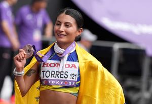 (250913) -- TOKIO, 13 septiembre, 2025 (Xinhua) -- La medallista de bronce Paula Milena Torres, de Ecuador, festeja con su...