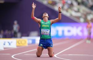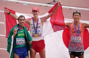 (250913) -- TOKIO, 13 septiembre, 2025 (Xinhua) -- El medallista de plata Caio Bonfim, de Brasil, festeja al término de...