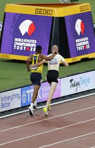 (250913) -- TOKIO, 13 septiembre, 2025 (Xinhua) -- Tim Van de Velde (i), de Bélgica, ayuda a Carlos San Martín,...