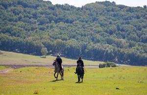 (250913) -- CHIFENG, 13 septiembre, 2025 (Xinhua) -- Imagen del 12 de septiembre de 2025 de turistas montando a caballo...