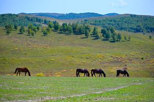 (250913) -- CHIFENG, 13 septiembre, 2025 (Xinhua) -- Imagen del 12 de septiembre de 2025 de caballos pastando en la...