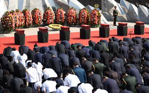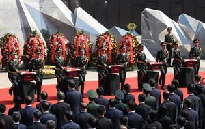 (250913) -- SHENYANG, 13 septiembre, 2025 (Xinhua) -- Personas se inclinan ante los restos de los mártires de los Voluntarios...