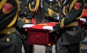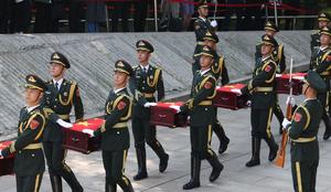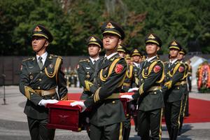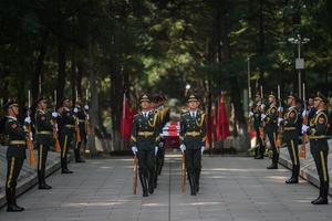 (250913) -- SHENYANG, 13 septiembre, 2025 (Xinhua) -- La guardia de honor escolta los féretros que contienen los restos de...