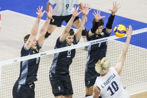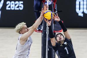 (250914) -- CIUDAD DE PASAY, 14 septiembre, 2025 (Xinhua) -- Luka Marttila (frente), de Finlandia, clava el balón durante el...